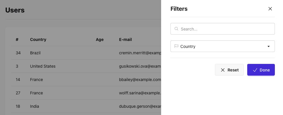 <x-drawer ...> ... <div class="grid gap-5"> <x-input placeholder="Search..." ... /> <x-select placeholder="Country" wire:model.live="country_id" :options="$countries" icon="o-flag" placeholder-value="0" /> </div> </x-drawer>