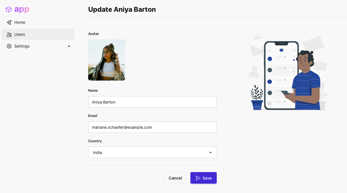 <div> <x-header title="Update {{ $user->name }}" separator /> <!-- Grid stuff from Tailwind --> <div class="grid gap-5 lg:grid-cols-2"> <div> <x-form wire:submit="save"> ... <x-slot:actions> ... </x-slot:actions> </x-form> </div> <div> {{-- Get a nice picture from `StorySet` web site --}} <img src="/edit-form.png" width="300" class="mx-auto" /> </div> </div></div>