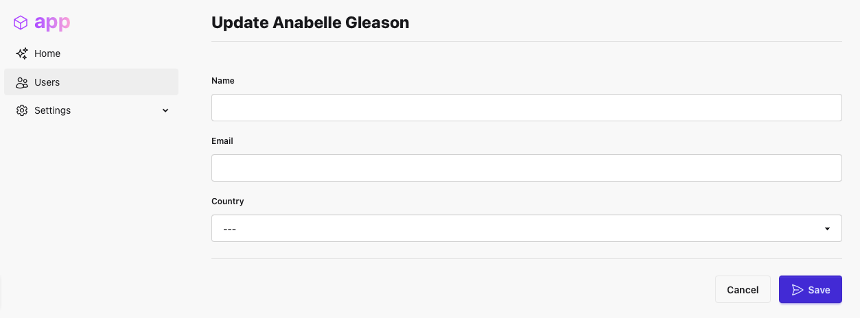 <div> <x-header title="Update {{ $user->name }}" separator /> <x-form wire:submit="save"> <x-input label="Name" wire:model="name" /> <x-input label="Email" wire:model="email" /> <x-select label="Country" wire:model="country_id" :options="$countries" placeholder="---" /> <x-slot:actions> <x-button label="Cancel" link="/users" /> {{-- The important thing here is `type="submit"` --}} {{-- The spinner property is nice! --}} <x-button label="Save" icon="o-paper-airplane" spinner="save" type="submit" class="btn-primary" /> </x-slot:actions> </x-form></div>